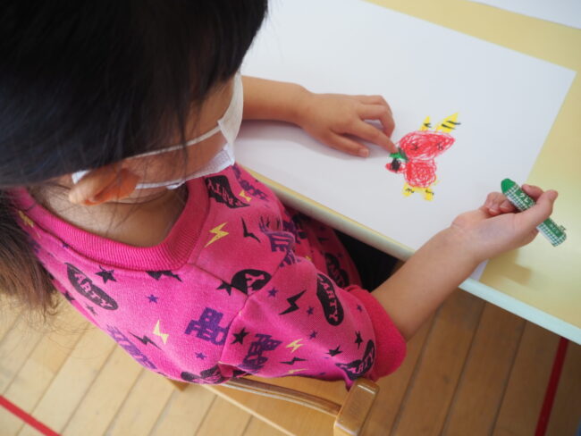 昨日のまめまき会の思い出画をしました。 楽しくお話し、思い出しながら描きましたよ! 昨日は、ちょっぴり怖かったけど、頑張ったね! かわいく描けたかな!? 出来上がると嬉しそうに教えてくれました!