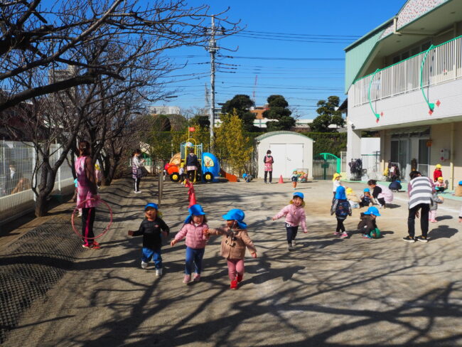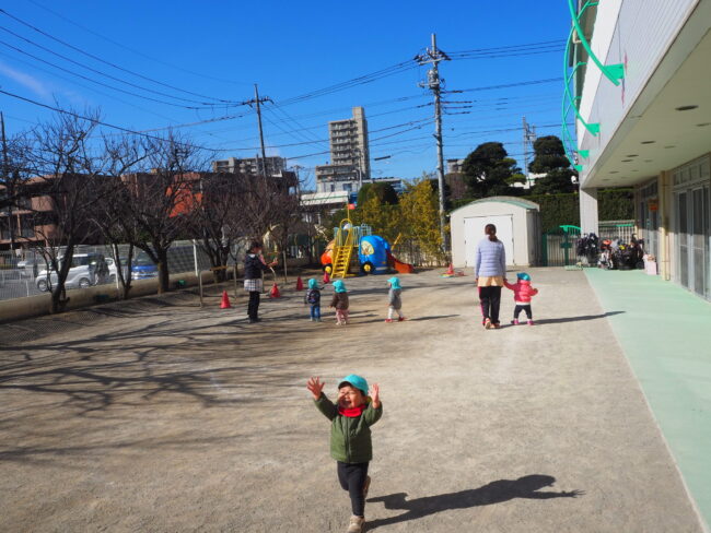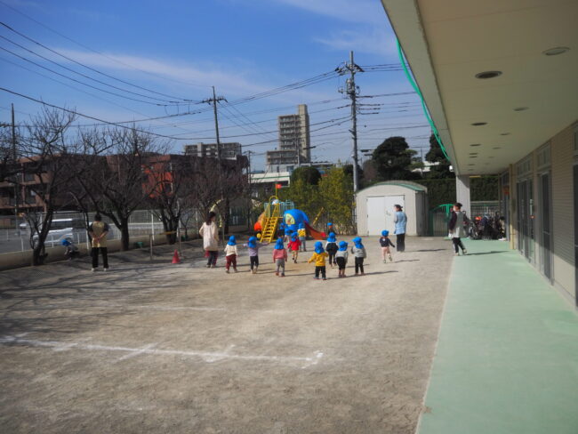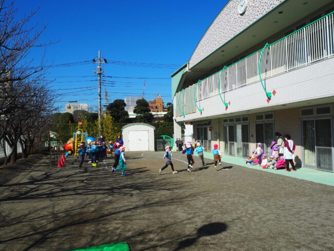 園庭でかけっこをしました! 先生の笛の音に合わせてスタートです! ジャンプジャンプして競い合いもしました。 その後は園庭遊びです。 ボールを投げたり、砂遊びをしました。