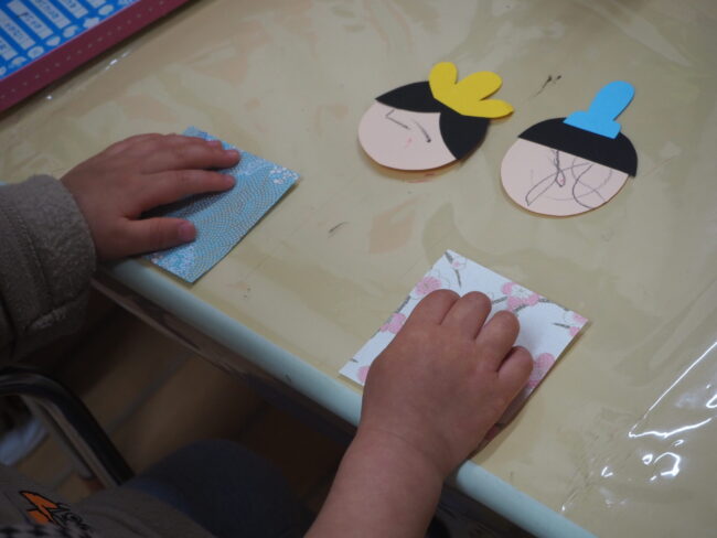 ひなまつりの製作をしました。 紙をクシャクシャにしたり、 糊やクレヨンを使ったりしました。 お気に入りの帽子を被って 製作をする子もいました。 ※ゆり組のお遊戯会の衣装の帽子です。 とっても人気ですよ!