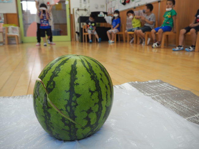 今日はスイカ割りの日です! 先生からのお話が始まります。 触って感触を確かめました。 棒を持って挑戦です! 大きいクラスは目隠しもします。 頑張ってスイカを割りましょう! 応援にも熱が入ります! ヒビが入ったかな!? あ…
