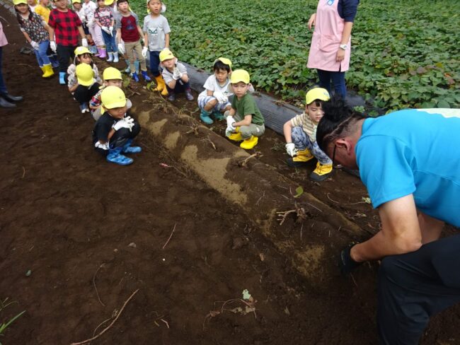 バスにのって!いってきまーす! 到着!バスを降りて農園に向かいます! いもほり場に到着! 農園の方に「いもほり」の秘訣を伝授されました! それじゃあ早速ほってみようっ! 頑張ってたくさん掘ったね!! 次は「…