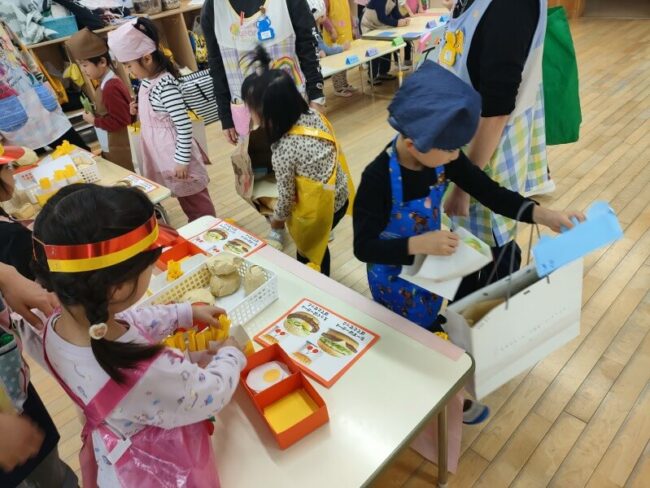 さぁクッキングのはじまりです! 終わったら調理室まで運びます! よくできました! エプロンは畳んでしまいます。 ご飯ができるまで、ゲームをしました! キミは何枚そろえられたかな?大盛り上がりでした! 遂に完成!ドライカレ…